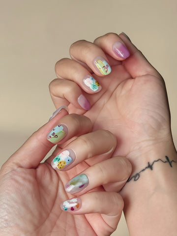 A soft green-and-white set dotted with tiny hand-painted blossoms and gold details. It feels fresh,...
