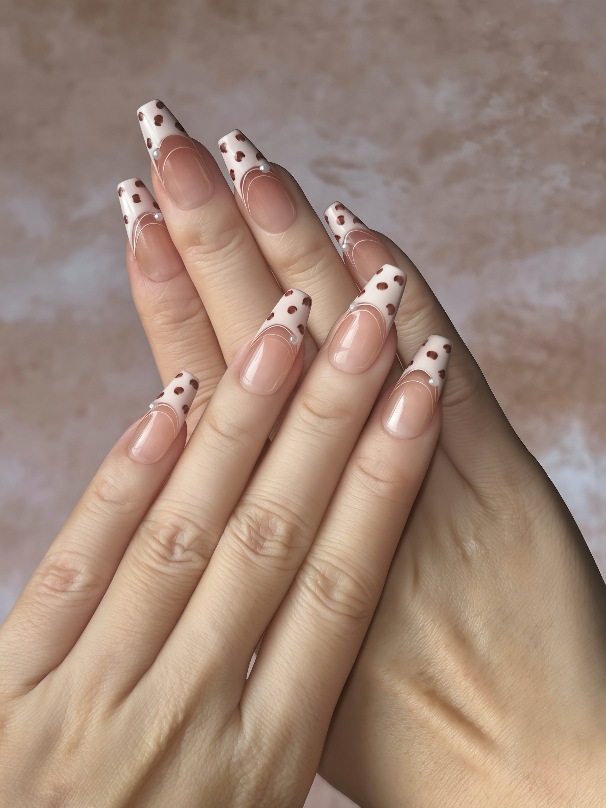 Gentle Wild is a soft T-French press-on set with blush-pink tips and hand-painted deep red leopard spots. Tiny pearls and fine line details add a subtle sparkle, creating a look that’s sweet, playful, and just a little wild. It’s the perfect set for coffee with friends, a fun night out, or any moment you want nails that feel stylish, flirty, and full of personality.